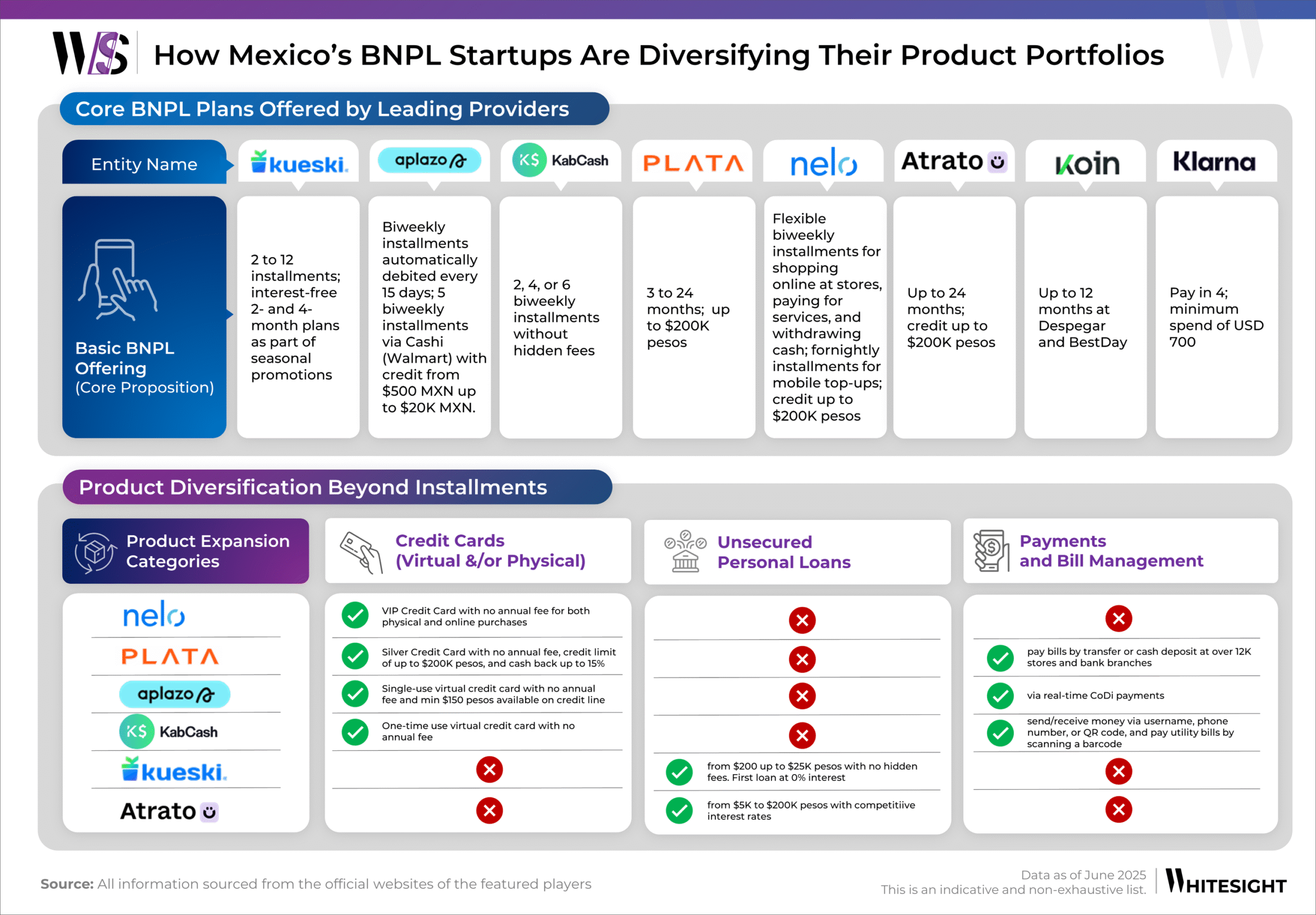 At the same time, BNPL in Mexico is evolving into a hybrid of embedded finance and micro-credit. Players like Kueski and Atrato Pago are stretching into personal loans, bringing short-term, non-collateralized lending into the same user flow. Others like Aplazo are embedding themselves into routine financial flows – bill payments, merchants’ payment portals (via Walmart’s Cashi), and even real-time CoDi integrations. The common thread: BNPL providers are embedding themselves into multiple moments of consumer financial decision-making. Each additional feature, be it a card, a credit line, or a utility bill payment, expands surface area, deepens stickiness, and extends monetization opportunities.
