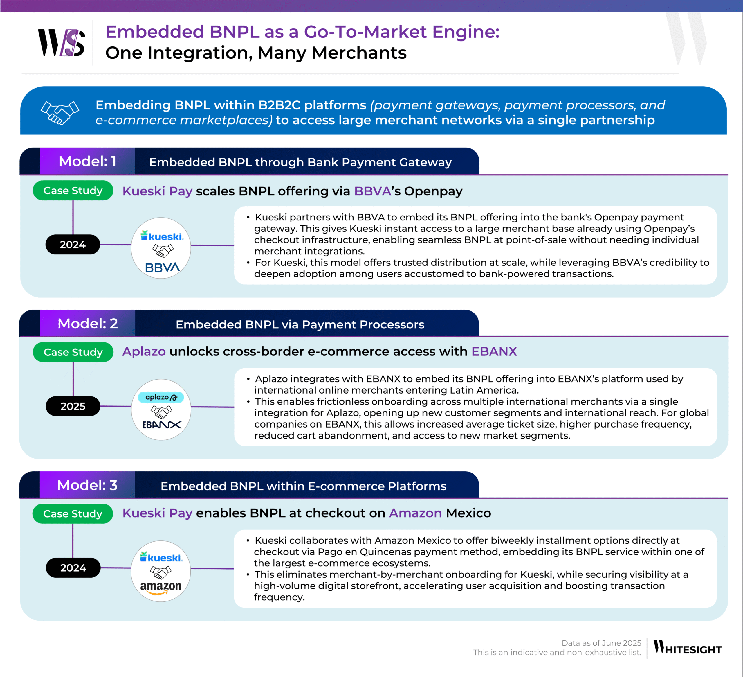 • Kueski Pay’s  2024 partnership with BBVA is a case in point. By integrating Kueski’s BNPL offering into BBVA’s Openpay gateway, the service becomes instantly available to thousands of merchants, and by extension, to millions of consumers who now get access to deferred payments without needing credit cards. This model allows BNPL to skip the trust-building cycle and piggyback off the brand equity of established institutions.