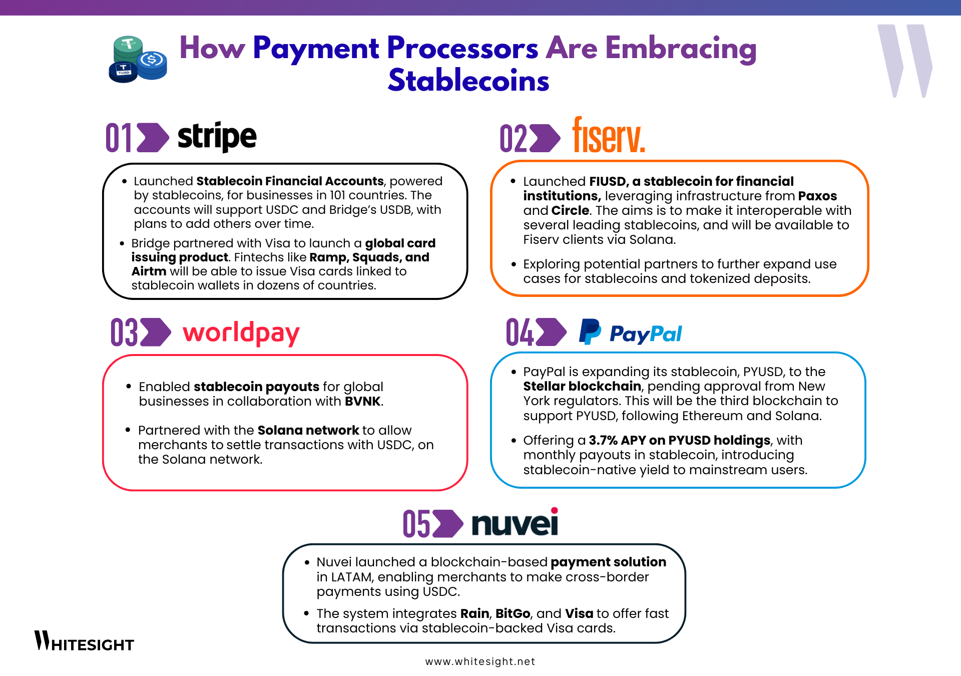 At the forefront of this transformation, leading payment processors likeStripe, PayPal, Worldpay, Nuvei, and Fiserv are strategically embedding stablecoins into their payment ecosystems. Through high-speed blockchain integrations, strategic partnerships, and incentivized financial products, they’re making stablecoin transactions not just practical, but profitable and scalable.
