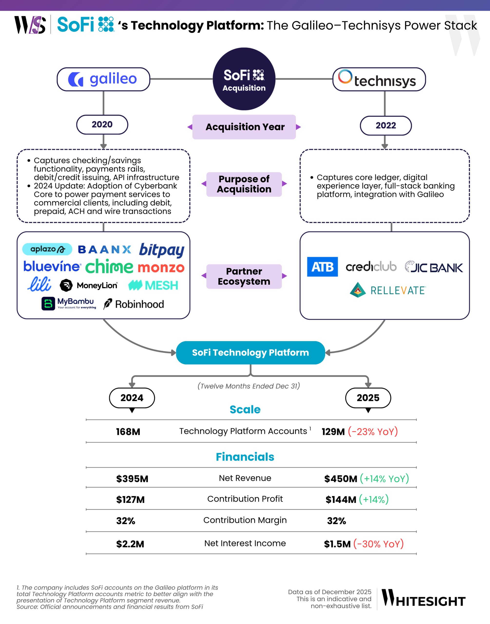 This is where SoFi made a very different bet. Instead of renting the technology that powers its financial products, SoFi bought the infrastructure themselves. It acquired Galileo Financial Technologies, a full suite of open APIs enabling companies to build modern consumer and B2B fintech services – from account setup and payments to card issuing and real-time transaction controls. Then came Technisys, a cloud-native, multi-product core banking platform. Through its Cyberbank system, it provides institutions the ability to design, configure, and manage innovative financial products across deposits, lending, and digital banking. Together, they gave SoFi ownership of the payments layer, the core ledger, and the digital experience engine underneath its products. Today, this same stack not only powers SoFi’s own bank but also serves dozens of fintechs, enterprises, and global financial institutions.